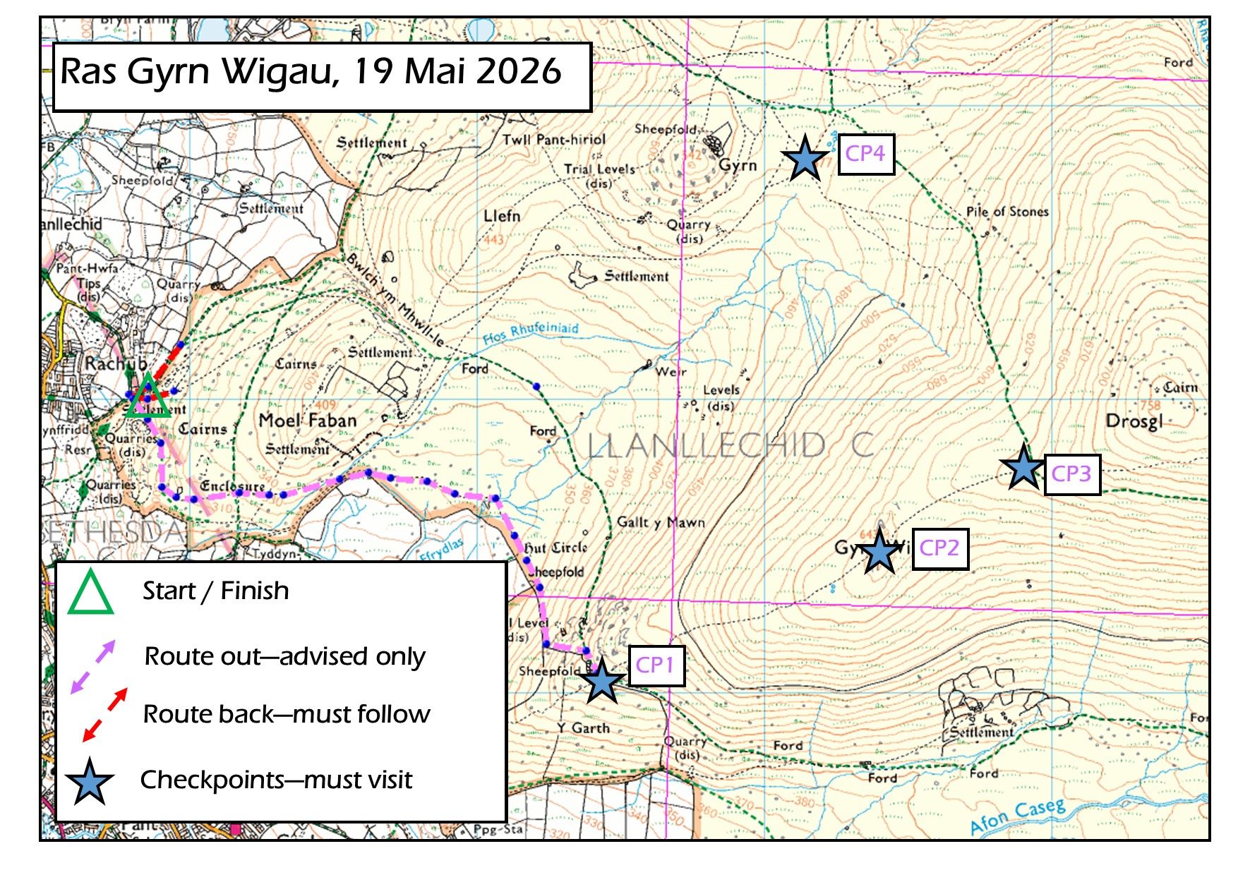 Route: All checkpoints have to be visited; advised route out is marked on map to CP1; final finish section must be followed; otherwise plenty of route choice.